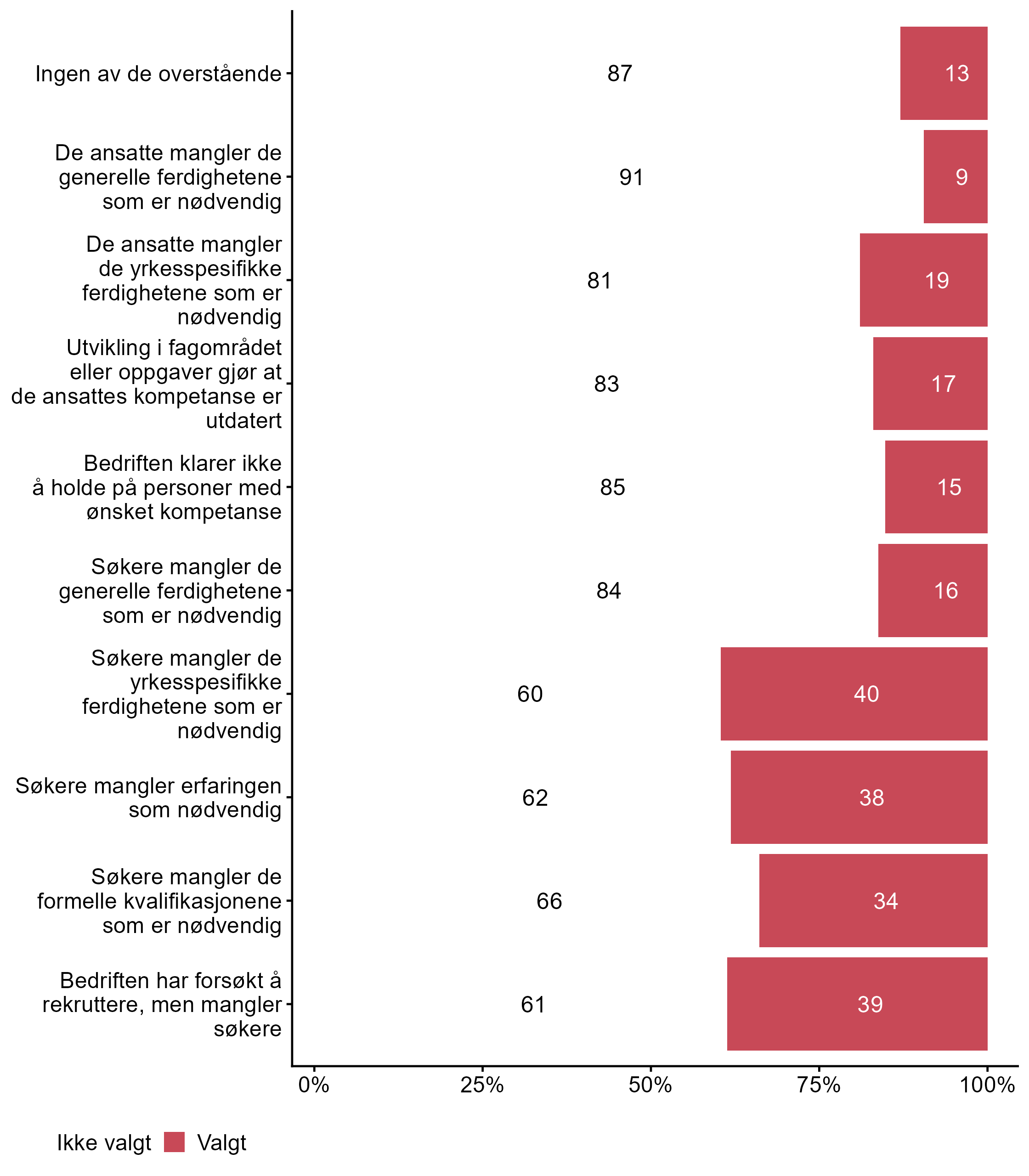 De som svarte “I noen grad” eller “I stor grad” på spørsmål om bedriften har et udekket kompetansebehov i dag, ble spurt om årsaker til og konsekvenser av kompetansebehovet, og ble bedt om å krysse av for det som passer best for bedriften. Svarfordelingen vises i figur 3 og figur 4.